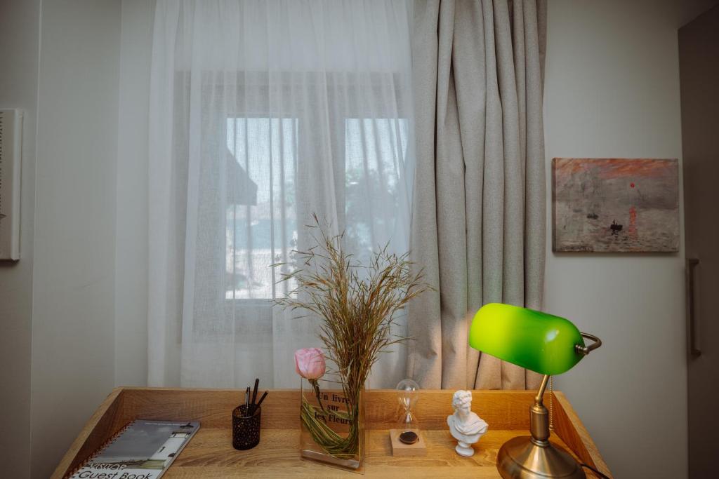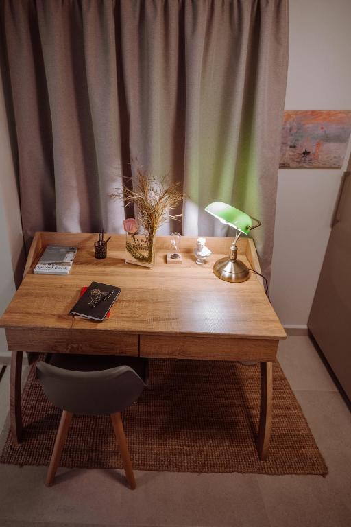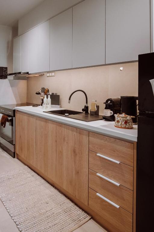 - Κουζίνα με ψυγείο, επαγωγική εστία, μαγειρικά σκεύη, ηλεκτρικό βραστήρα, τοστιέρα, τραπέζι